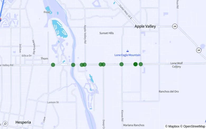 - 9. Apple Valley – Hesperia. Bear Valley RD entre Navajo RD y Tamarski RD, con 10 accidentes y 13 víctimas.