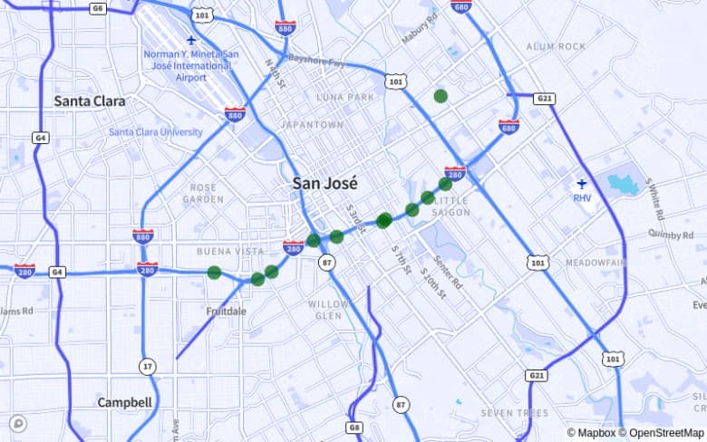 - 8. San José. I-280 desde Meridian Ave. hasta Wilshire Blvd, con 11 accidentes y 12 víctimas.