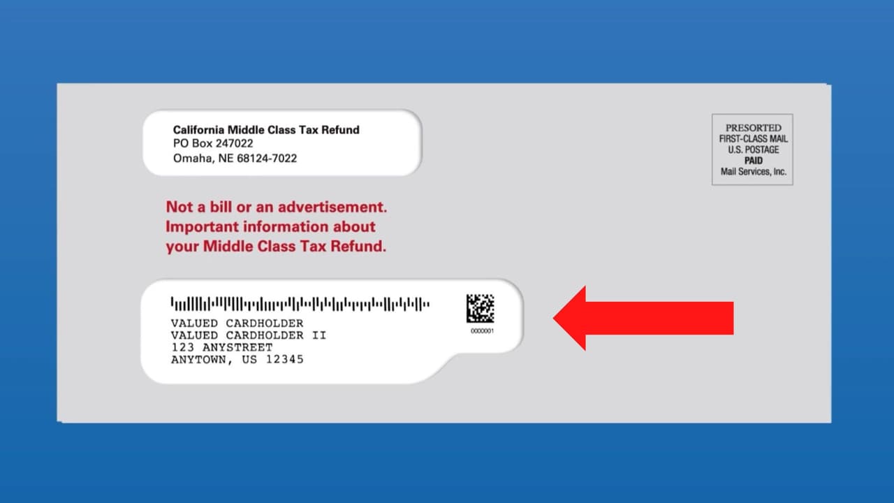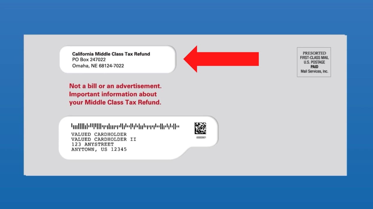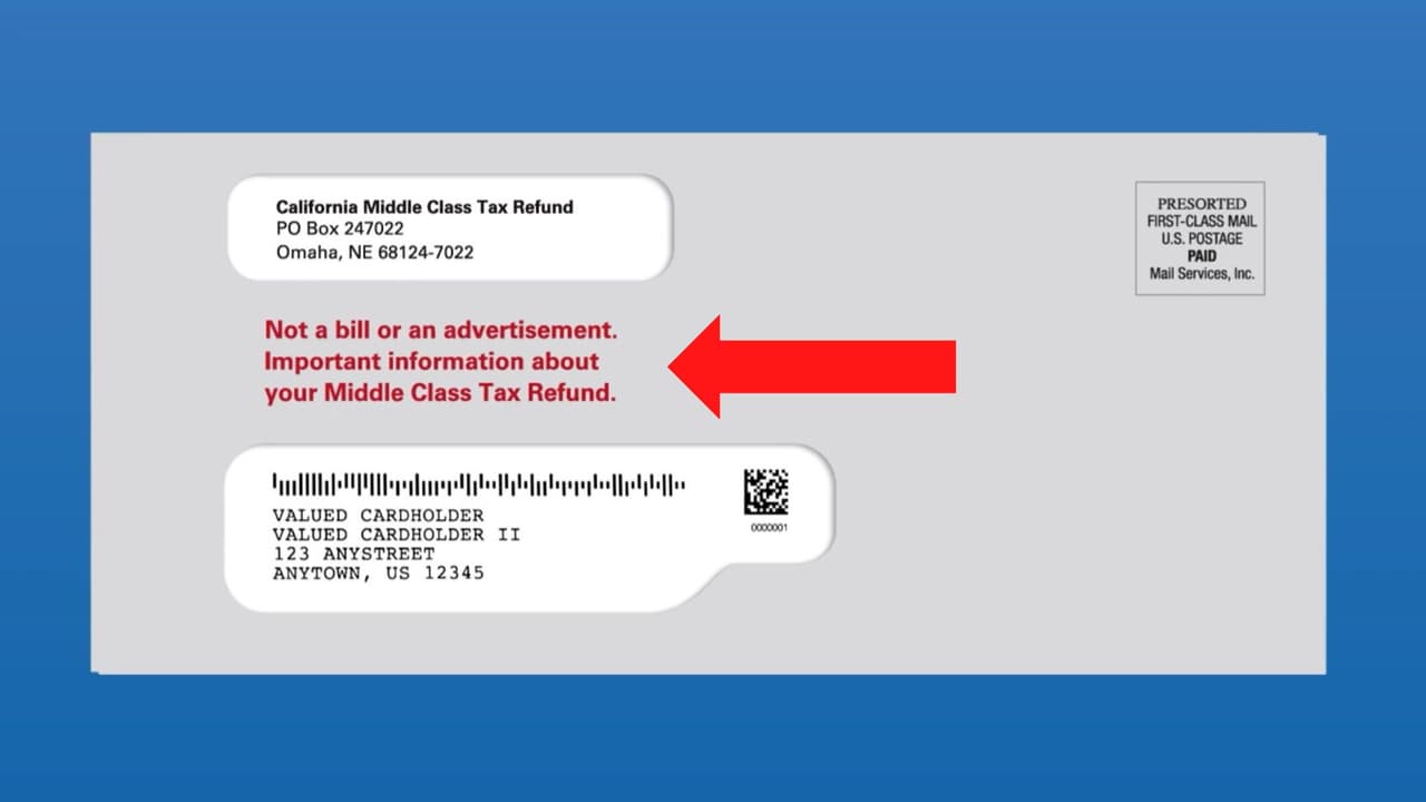 - “Not a bill or an advertisement. Important information about your Middle Class Tax Refund” o “No es una factura ni un aviso. Información importante sobre el Reembolso Tributario para la Clase Media”, en español.