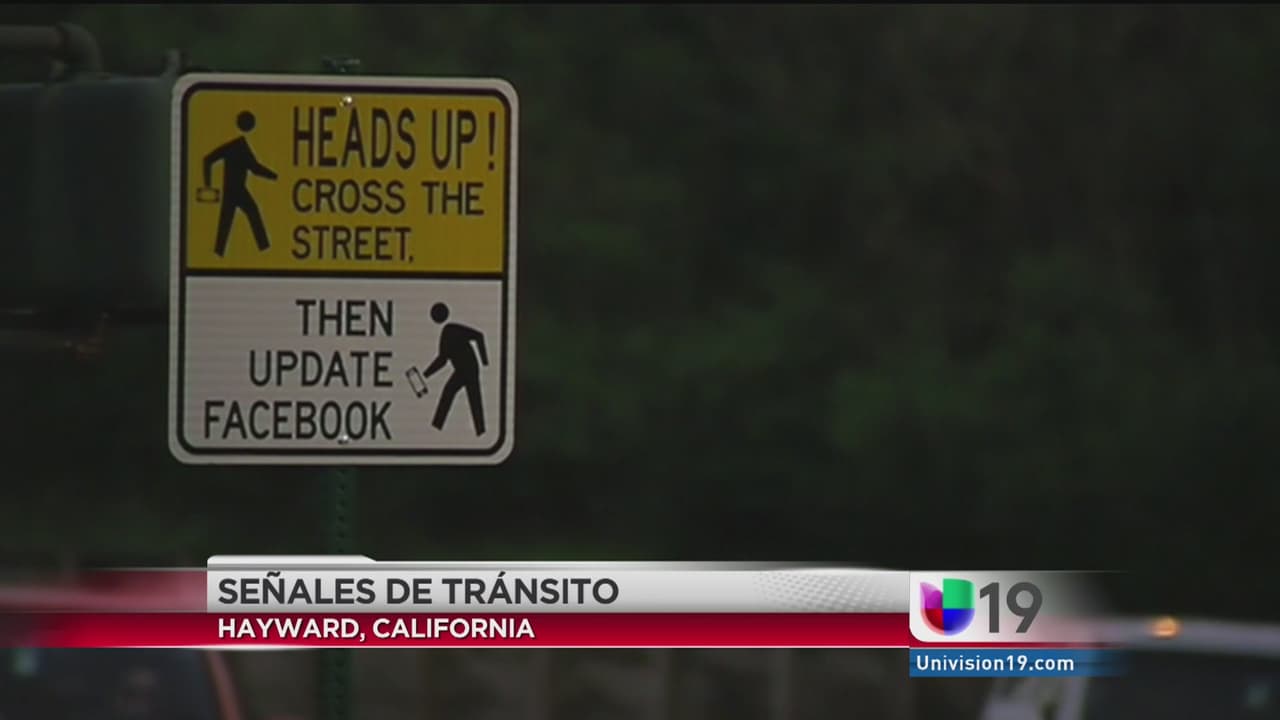 En Hayward, California, hay señales de tránsito que advierten sobre la actualización de Facebook al cruzar la calle o el ir 'texteando' al manejar.
