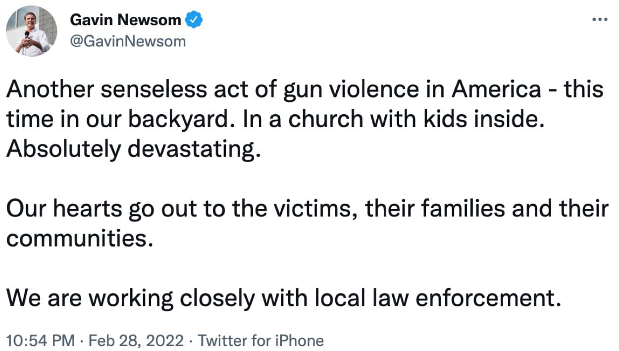 Al conocer sobre la tragedia, el gobernador de California, Gavin Newsom, expresó su sentir a través de un tuit.