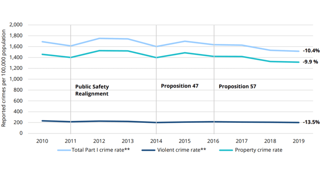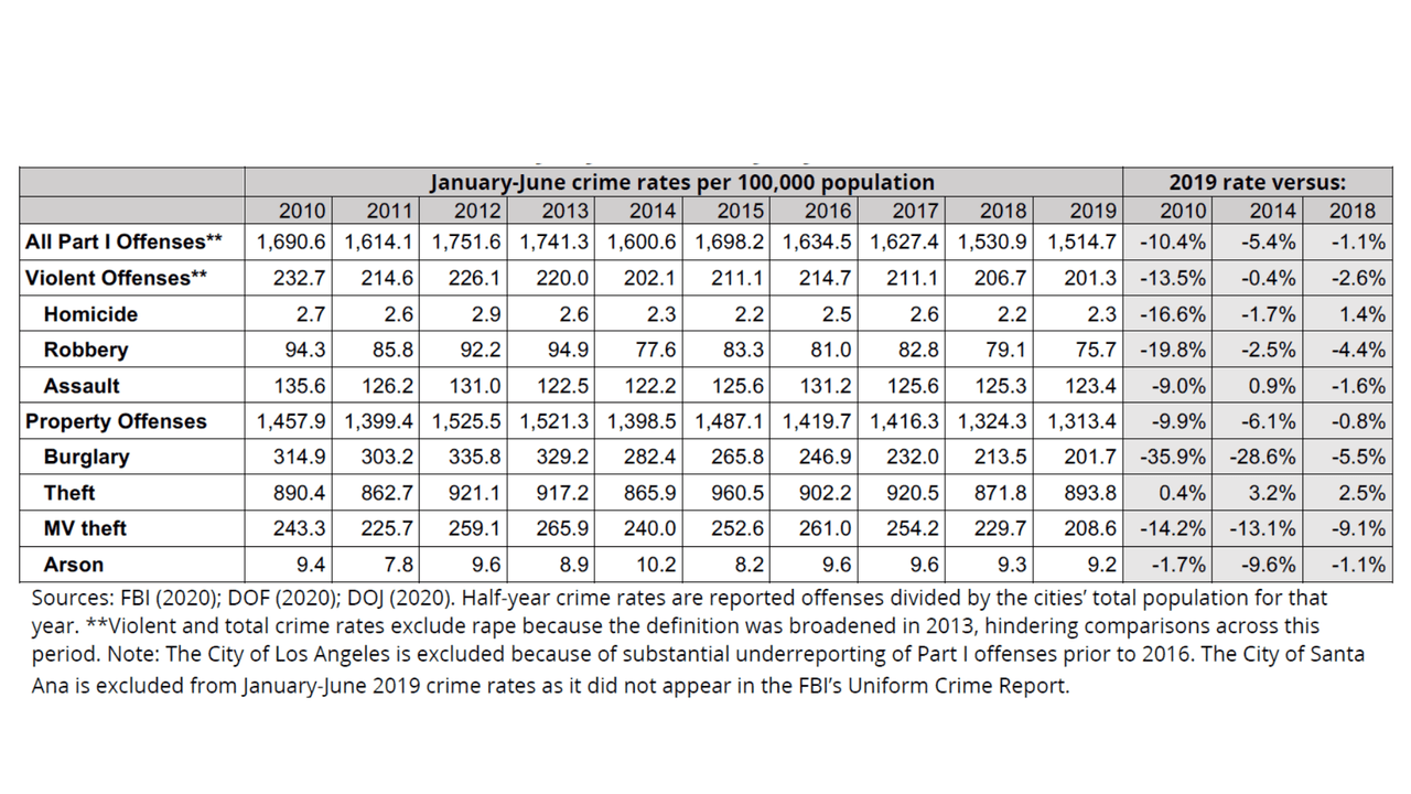En los primeros seis meses de 2019, 69 ciudades de California con poblaciones de más de 100,000 habitantes mostraron que las tasas de delitos violentos y de propiedad habían disminuido 10.4% en comparación con el primer semestre de 2010.