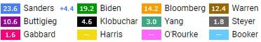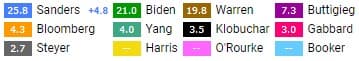 A nivel nacional también lleva la delantera con el 25.8 por ciento de las preferencias, seguido igualmente por Biden, con el 21 por ciento, pero en el tercer lugar se ubica Michael Bloomberg.
