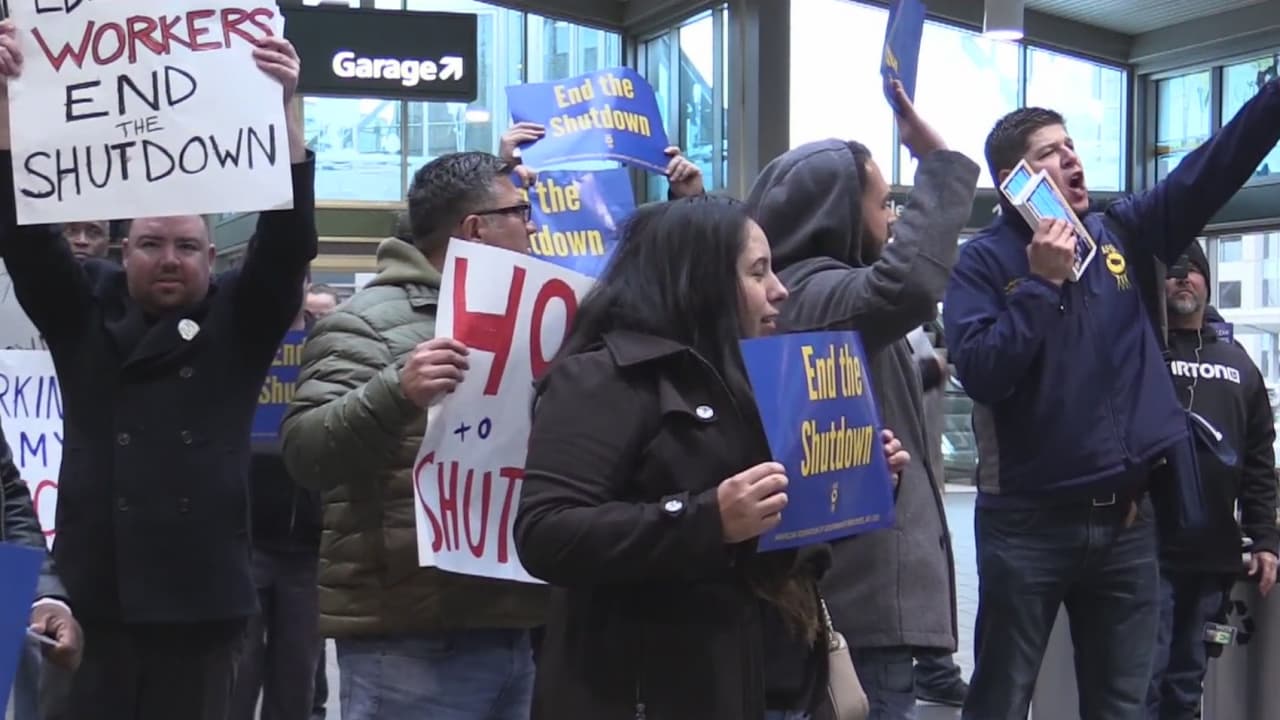 Decenas de empleados y activistas protestaron por el cierre de gobierno más largo de la historia. Algunos han dejado de recibir sueldo, por lo que expresan su inconformidad.