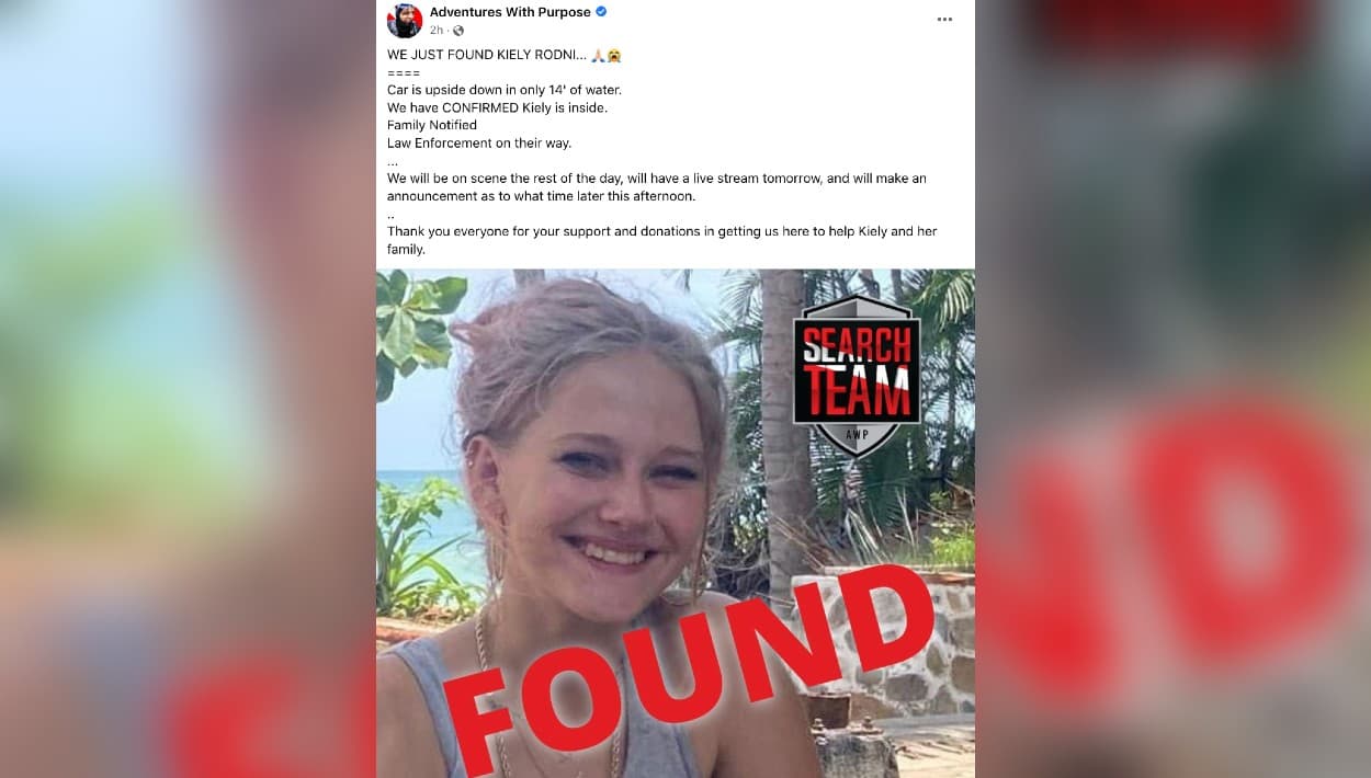 De acuerdo con la publicación en la página de Facebook de la organización, el automóvil de Rodni fue encontrado volcado bajo "14 pies de agua" (4.2 metros) con el cuerpo de la joven dentro. Las autoridades ya fueron notificadas.