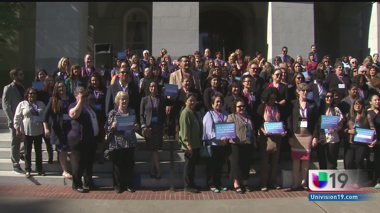 Un grupo de mujeres piden al gobernador de California, Jerry Brown, mayor presupuesto para programas en contra de la violencia contra las mujeres.