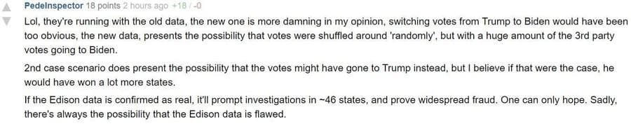 Un usuario llamado "PedeInspector" en TheDonald.win afirma que robó los archivos de "Edison" de The New York Times y los usó para identificar momentos en los que, afirma, los votos se cambiaron repentinamente del conteo de Trump al conteo de Biden.