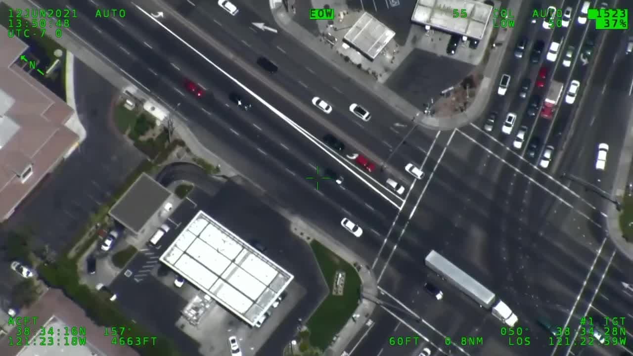 El video capturado por el avión de CHP muestra al sospechoso acelerando y zigzagueando a través del tráfico de Watt Avenue antes de intentar tomar una rampa de entrada a la autopista. El sospechoso se salió de la carretera y el vehículo se estrelló y volcó.
