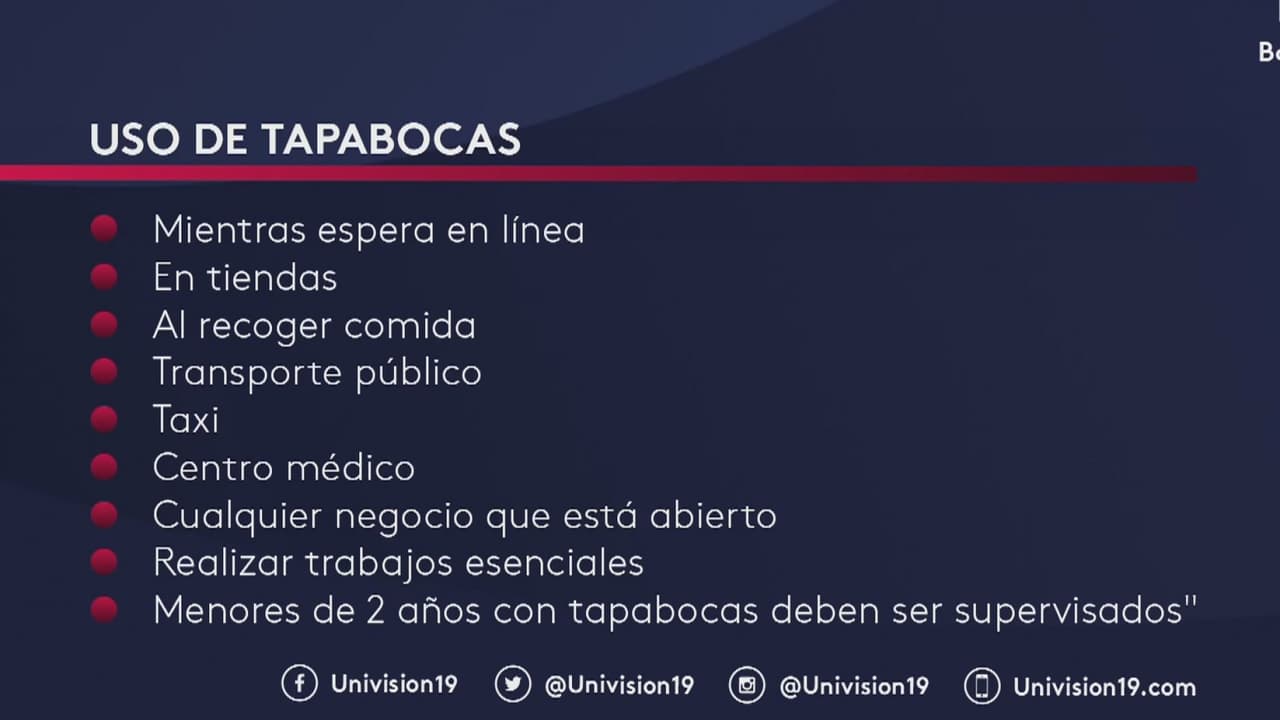 El uso del tapabocas será requerido mientras espera para ingresar a algún establecimiento, en tiendas, al recoger comida de un restaurante, en el transporte público y otros.