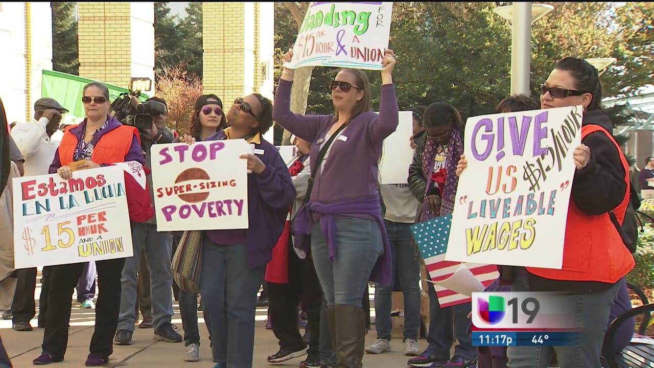 Decenas de trabajadores protestaron frente a la alcandía de Sacramento para pedir un aumento de sueldo.