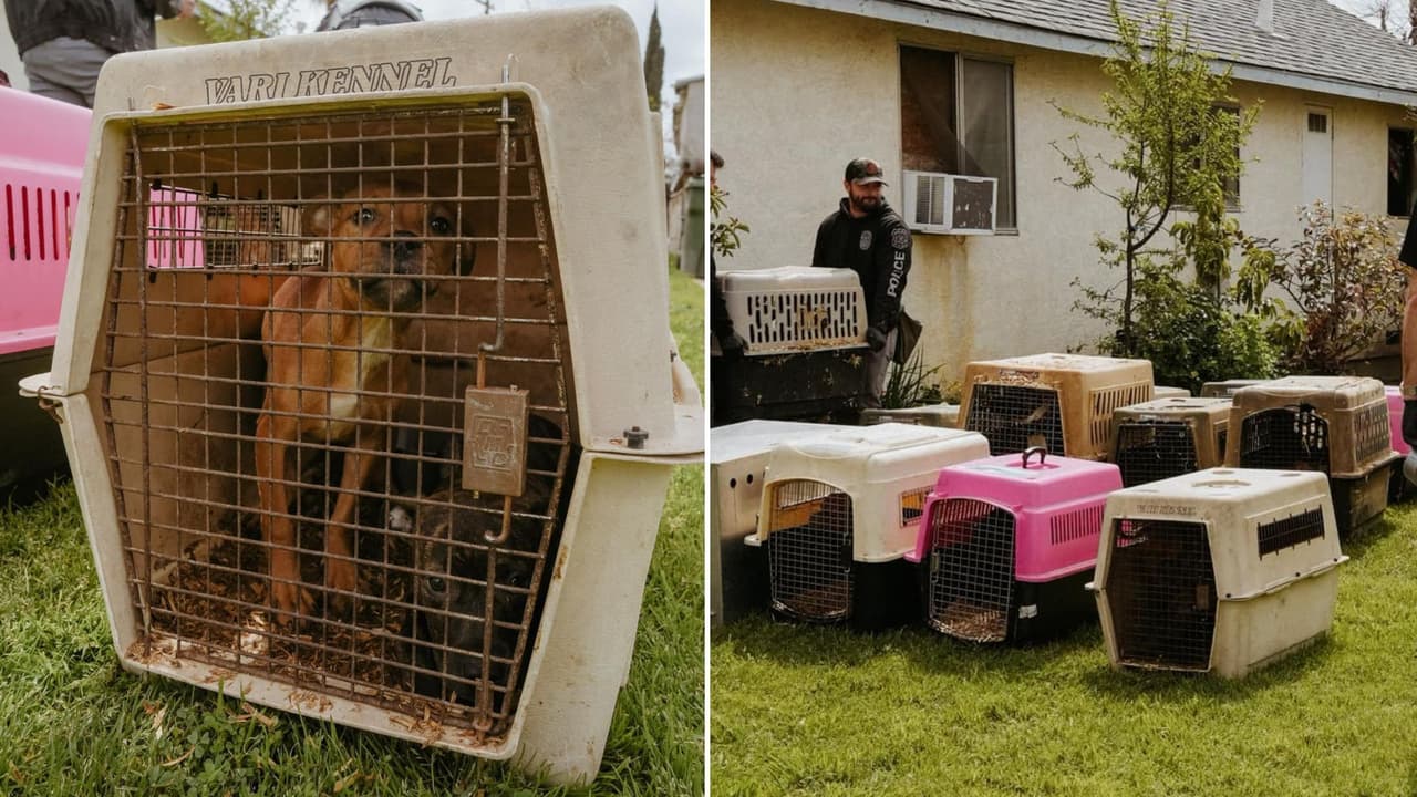 La policía de Turlock rescató a 73 perros que estaban hacinados en pequeñas jaulas bajo condiciones deplorables. Según testimonios, los animales eran obligados a ser parte de peleas clandestinas.