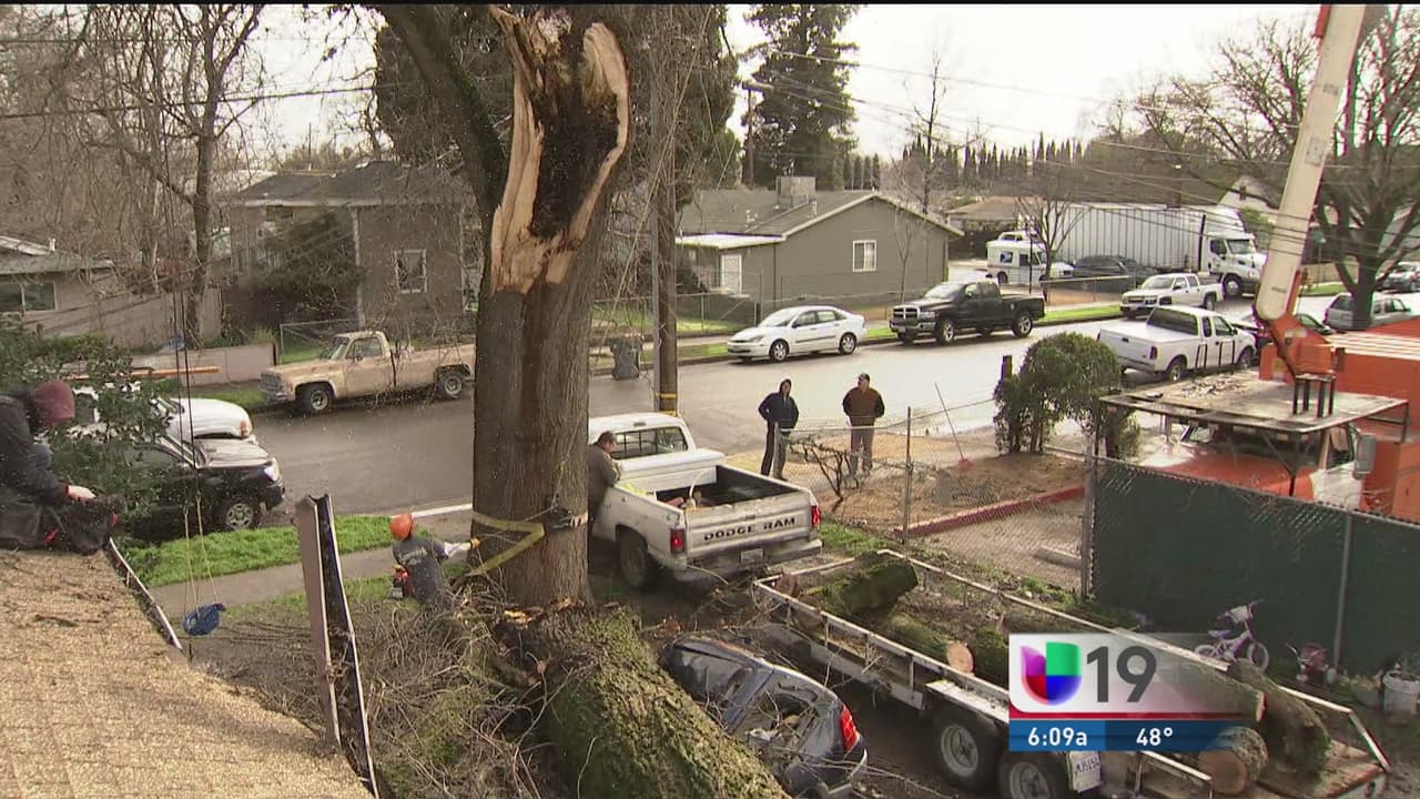 Múltiples familias se vieron afectadas en Woodland cuando un enorme árbol cayó en una vivienda y aplastó cuatro vehículos.