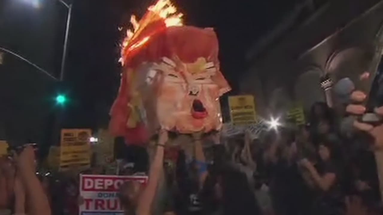 Decenas de personas marcharon este miércoles en la ciudad gritando “No es mi presidente”. Se reporta que algunas personas quemaron una piñata del presidente electo y una bandera de Estados Unidos.