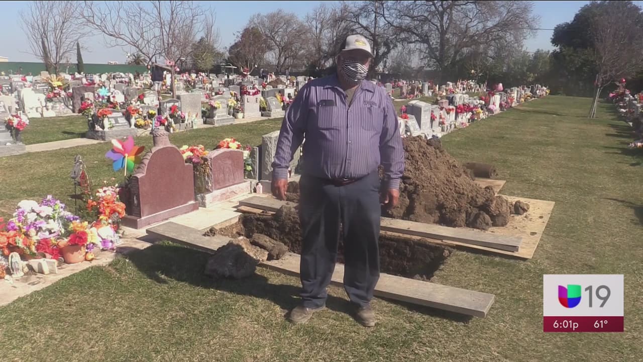 Gonzalo Mora lleva 36 años trabajando como sepulturero y aseguran ahora hay más demanda de su trabajo y es que cifras indican que en el Cementerio Católico de Stockton se realizan un promedio de cinco sepulturas diarias y de 27 a la semana.