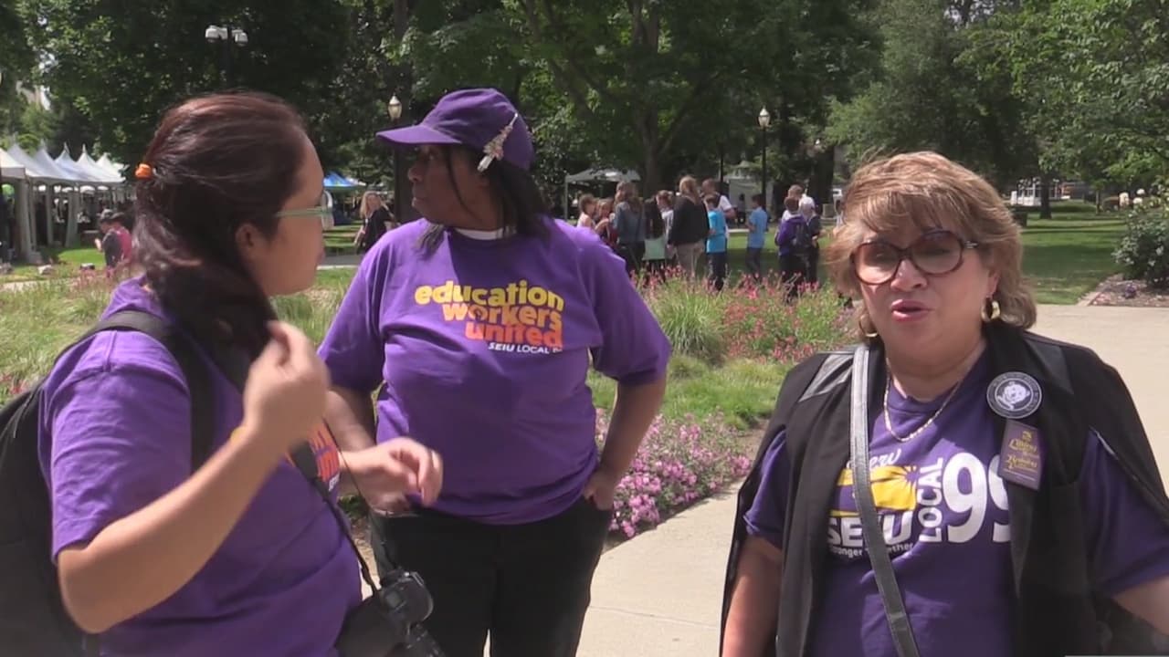 Trabajadores de la educación exigen en el capitolio de California recibir salario en verano