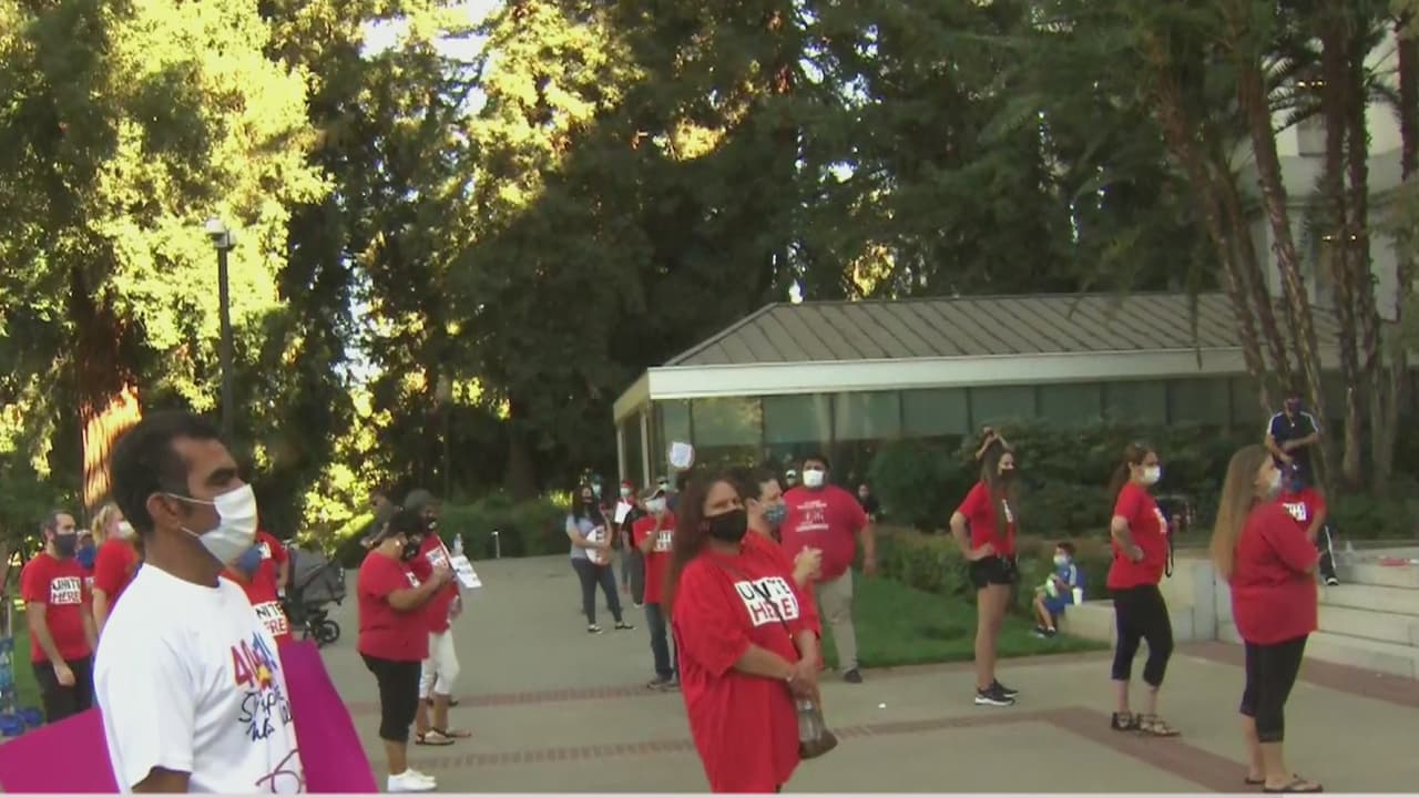 Un grupo de trabajadores despedidos de la industria hotelera, restaurantes y la aviación protestaron frente al Capitolio estatal, para pedir al gobernador Gavin Newsom que promulgue la propuesta de ley AB 3216 que les aseguraría regresar a sus trabajos una vez que la pandemia termine y se reabran en su totalidad dichas industrias.