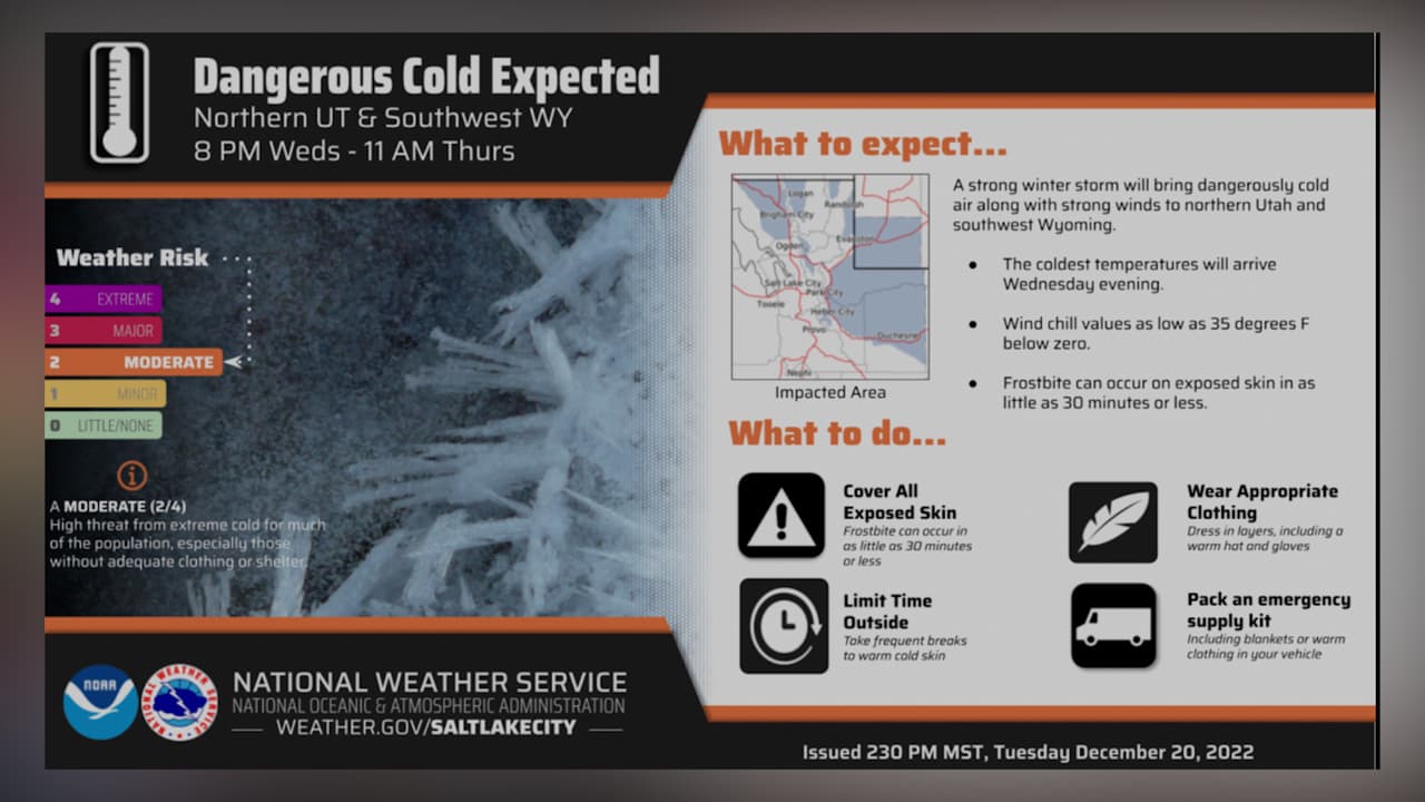 También está vigente una advertencia de sensación térmica para una gran parte del estado hasta las 11 a. m. El Servicio Meteorológico Nacional advierte sobre peligrosas temperaturas frías , ya que la sensación térmica podría llegar a -35 grados en las áreas afectadas: condado de Box Elder, Bear Lake área, Wasatch Back, Uinta Mountains y Uinta Basin.