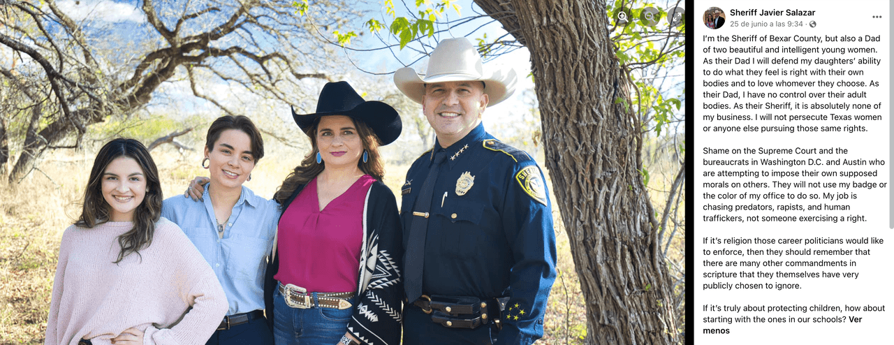 "Soy el alguacil del condado de Bexar, pero también soy el padre de dos hermosas e inteligentes mujeres jóvenes. Como su padre, defenderé la capacidad de mis hijas de hacer lo que sienten que es correcto con sus propios cuerpos y de amar a quien elijan. Como su papá, no tengo control sobre sus cuerpos adultos. Como su alguacil, no es de mi incumbencia. No perseguiré a las mujeres de Texas ni a ninguna otra persona que persiga esos mismos derechos”, expresó Salazar.