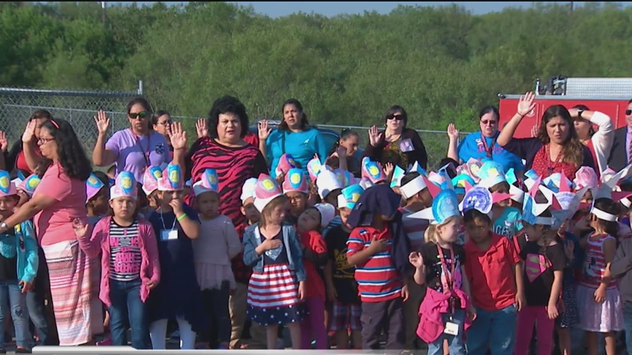 Alumnos de la primaria Heritage vieron aterrizar al Little One, helicóptero utilizado por la policía de San Antonio, quienes de ésta manera conmemoraron un aniversario más del 11 de septiembre.
