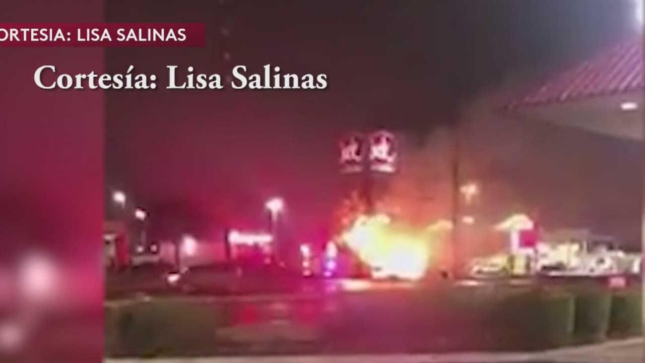 Varios testigos captaron en sus celulares el aparatoso incendio que ocurrió tras un choque con una línea telefónica, que provocó un incendio en el vehículo que se extendió a un anuncio y un restaurante. Fue necesario el trabajo de los bomberos por dos horas para sofocarlo. El responsable escapó y está siendo buscado por la policía.