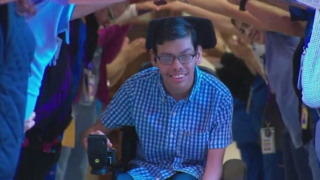 Compañeros, familiares y doctores celebran al joven que este miércoles finalizó su tratamiento y despide la clínica tras cuatro años de esfuerzo.