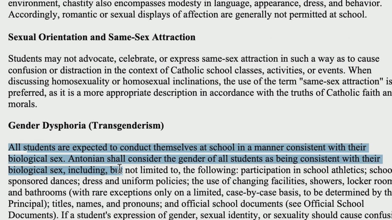 Una exalumna de esta escuela publicó en su cuenta de Instagram una foto del manual de comportamiento de estudiantes, donde se amenaza con expulsar a las personas transgénero, además de prohibir expresar la atracción a personas del mismo sexo.