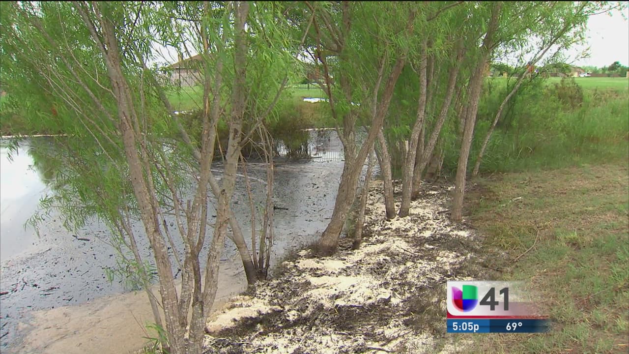 Las fuertes lluvia causaron serios daños a las propiedades en residentes de Lytle, Texas, luego de que un rayo impactó un depósito de petróleo y éste se rompiera derramándose en el lago.
