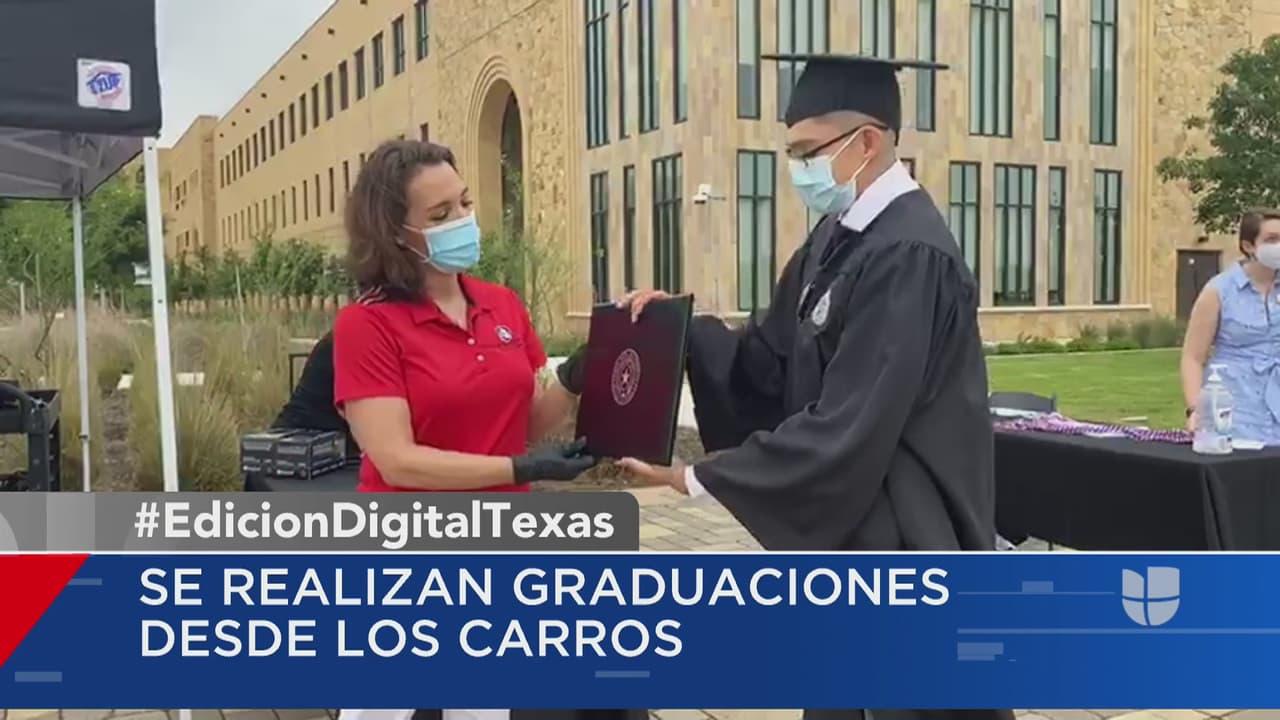 Estudiantes de Texas A&M celebran su graduación desde sus vehículos