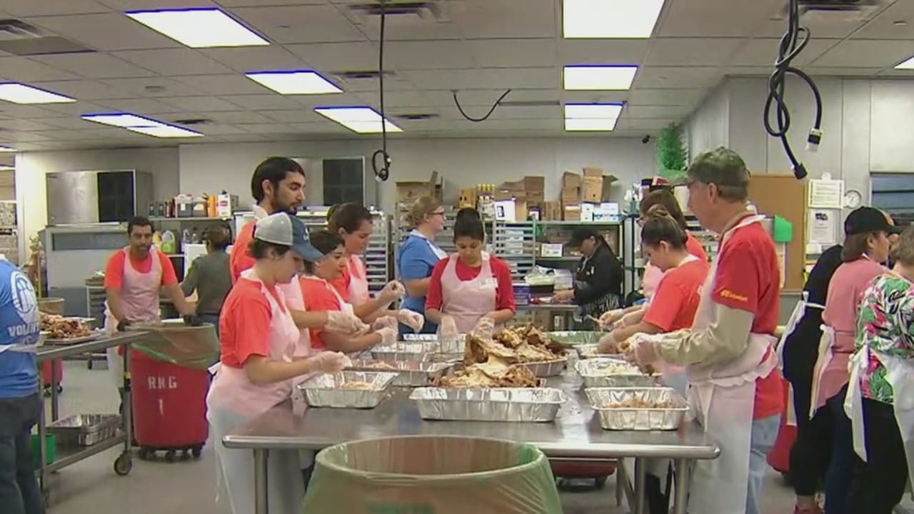 Voluntarios se encuentran en el Centro de Convenciones trabajando en los últimos preparativos para esta cena en la que se prepararán más de nueve mil libras de pavo para 25,000 personas.