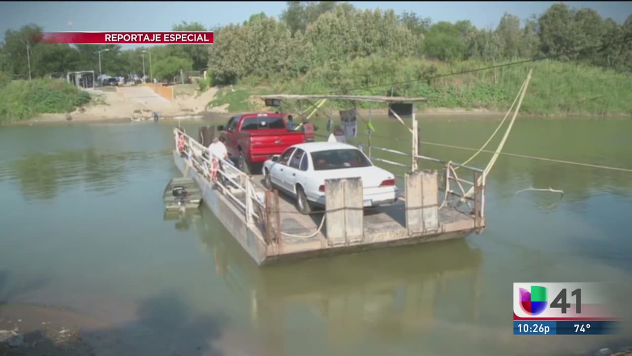 Univision viajó a un cruce internacional en la frontera texana que data del siglo pasado en donde una panga cruza el Río Bravo solamente jalado por una cuerda.