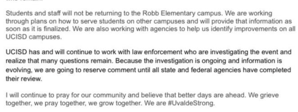 "Los estudiantes ni maestros regresarán a la escuela Robb. Estamos trabajando en un plan sobre cómo servirle a los estudiantes en otros campus y les dejaremos saber tan pronto finalizemos", lee la carta de Hall Harrel, superintendente de UISD dirigida a los padres.