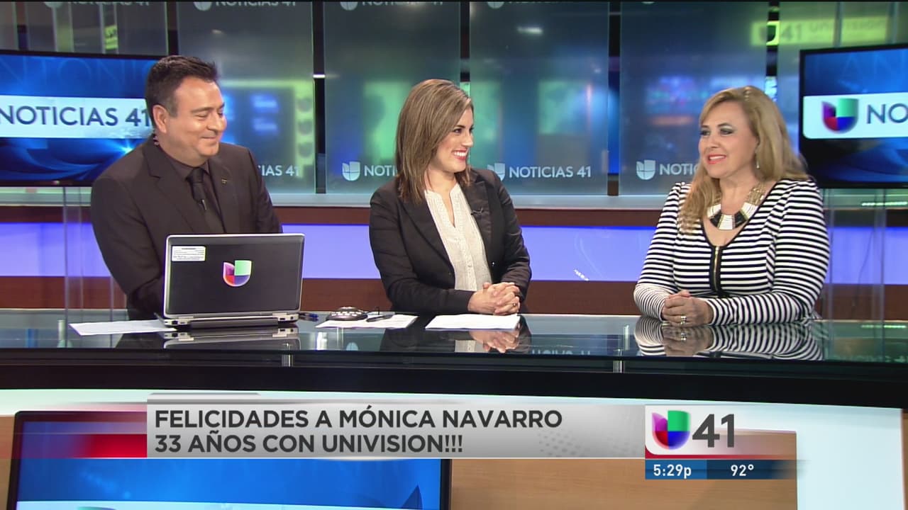 La periodista multigalardonada Mónica Navarro cumple 33 años de carrera en Univision, por lo que el equipo le extiende una gran felicitación y agradecimiento por su trabajo.