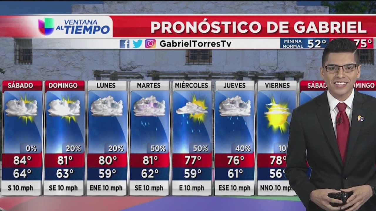Las máximas para este sábado en San Antonio llegarán a 84 grados, con cielos nublados. A partir del domingo regresa la probabilidad de lluvia.