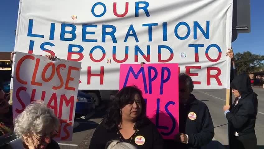 Las personas presentes sostienen pancartas en las que se lee: "MPP es igual a violencia" y otras señalan que dicho política es "una violación" por lo que deben eliminarla.