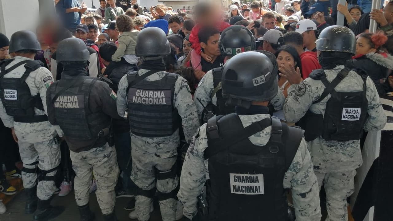 Mientras que la Guardia Nacional del lado mexicano no pudo contener a la multitud que intentó cruzar, la Patrulla Fronteriza colocó alambres con púas, a la vez que portaban escudos y armas de gas.