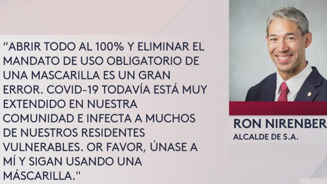 Nirenberg se hizo eco de Wolff en un tweet: “Abrir todo al 100 por ciento y al mismo tiempo rechazar nuestro mandato de mascarillas es un gran error. ... No te cortas el paracaídas justo cuando has frenado tu descenso".