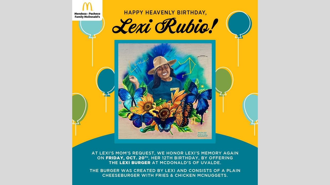 UVALDE; Texas.- En honor al cumpleaños de Lexi Rubio, una víctima del tiroteo en la Escuela Primaria Robb, una sucursal de McDonald’s en Uvalde servirá un menú especial este viernes 20 de octubre.