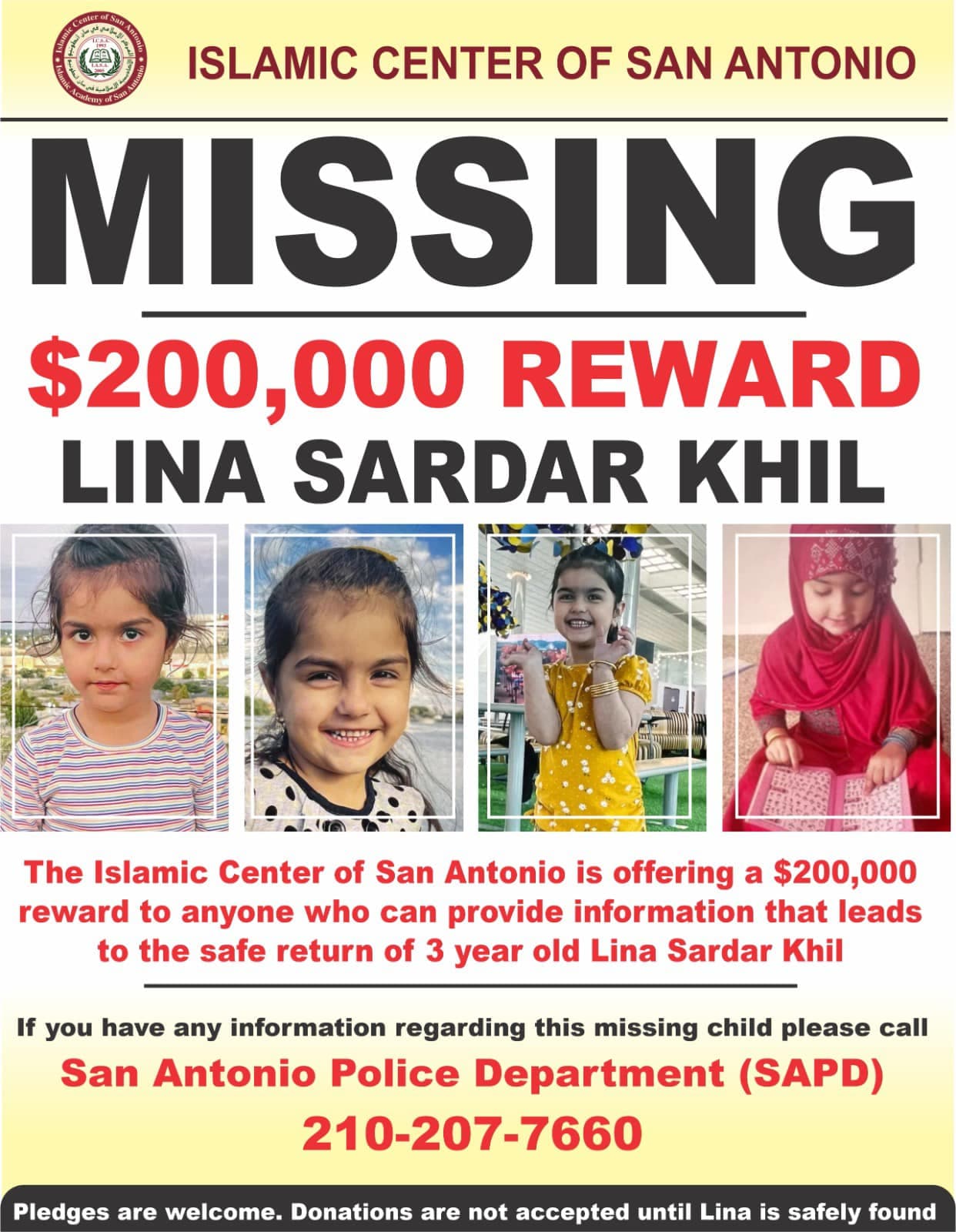 SAN ANTONIO, Texas. - Subió a 250,000 dólares el monto de la recompensa por pistas que ayuden a encontrar a Lina Sardar Khil, la niña afgana desaparecida en San Antonio desde hace dos meses.