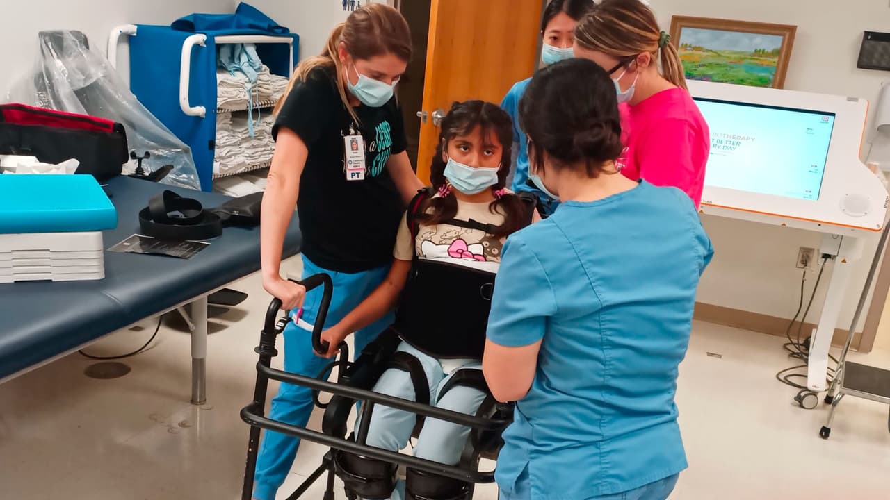 Mia logró caminar en el hospital junto con las terapeutas físicas y personal médico con la ayuda de una mochila especial.