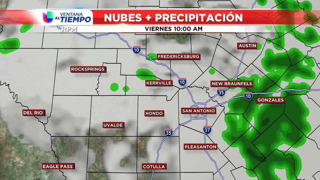 A partir de la 1pm de este viernes , se sentirán fuertes vientos. Después de las 6pm se esperan tormentas severas, de hasta tres pulgadas de precipitación, con granizo. El mayor riesgo de estas tormentas severas tendrá escenario en la interestatal 35. El granizo que pudiera generarse pudiera ser de hasta 2 pulgadas de diámetro. Asimismo, se espera lluvia de 1/4 de pulgada a 3/4 de pulgada de lluvia, con cantidades más altas aisladas de 1 a 3 pulgadas.