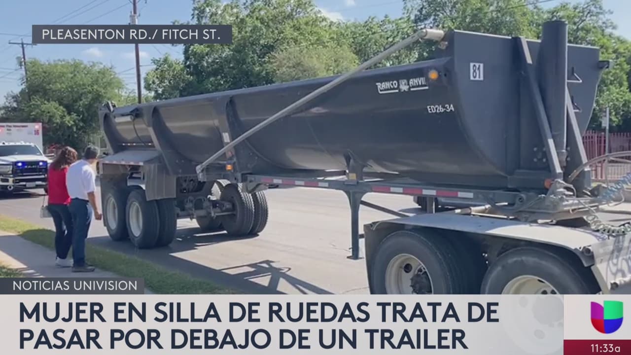 SAN ANTONIO; Texas.- Una mujer que intentó pasar con su silla de ruedas bajo un tráiler que estaba detenido en un alto queda levemente herida al ser impactada por la unidad cuando arrancó nuevamente.
