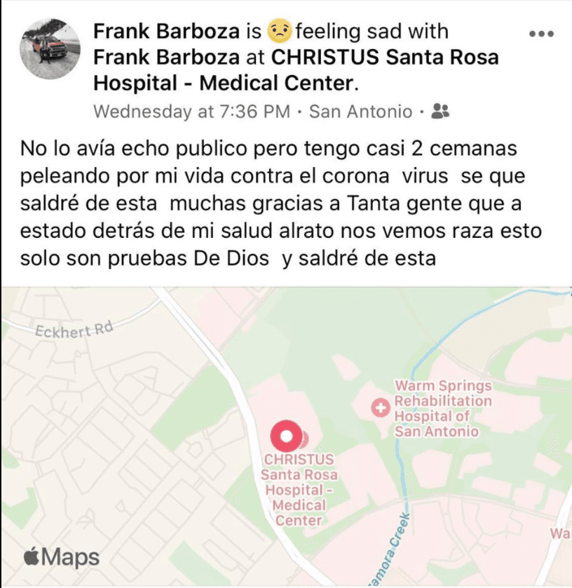 SAN ANTONIO, Texas.- Frank Barbosa, un hombre hispano de 45 años, hizo un llamado en las redes sociales tras haber contraído el coronavirus.