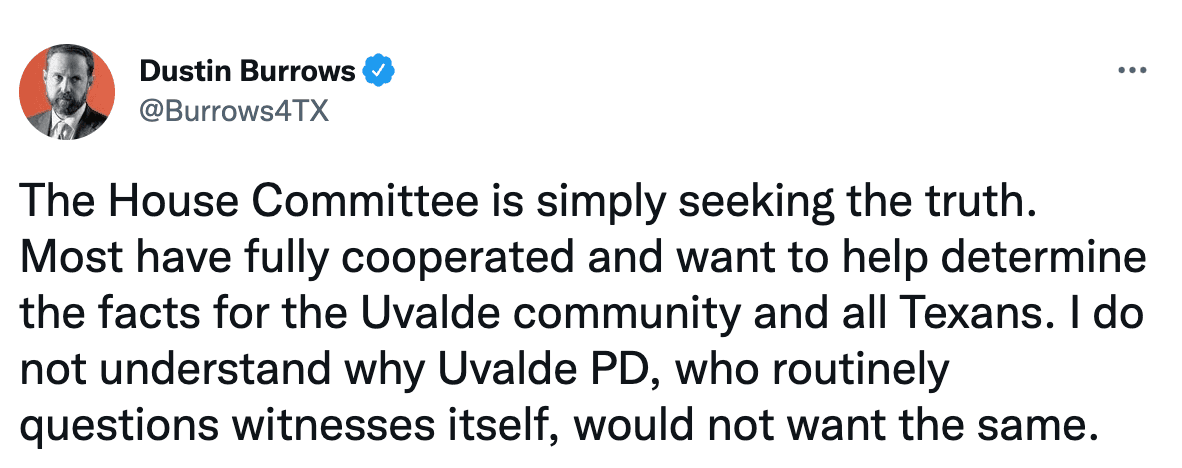 Burrows, republicano por Lubbock y quien preside el panel, había puesto en duda el jueves si la policía de la ciudad participaría voluntariamente. El representante había preguntando en las redes sociales por qué el Departamento de Policía de Uvalde no querría "ayudar a determinar los hechos para la comunidad de Uvalde y todos los texanos".