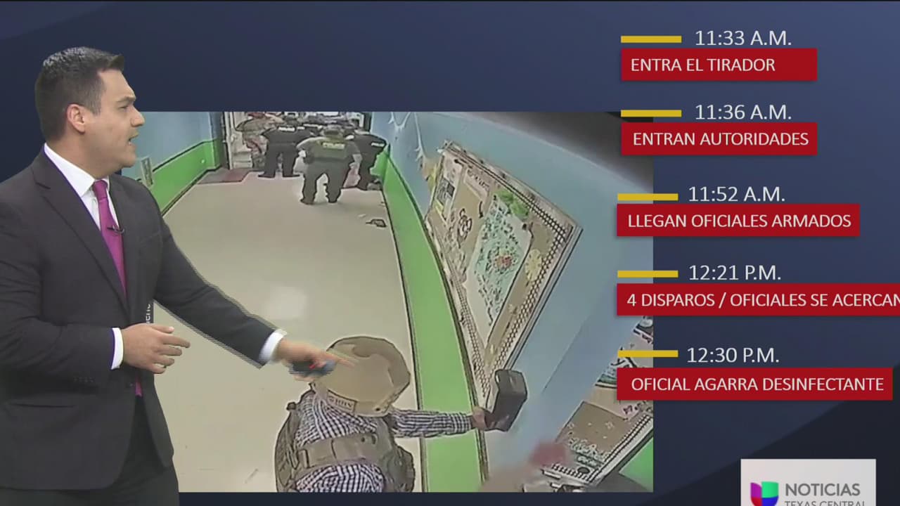 Un periódico de Austin reveló sin censura un video de 4 minutos, de los 77 de duración, de las cámaras de vigilancia del pasillo de la escuela la mañana del 24 mayo. Te damos un recuento de los puntos clave de la fallida intervención de la policía.