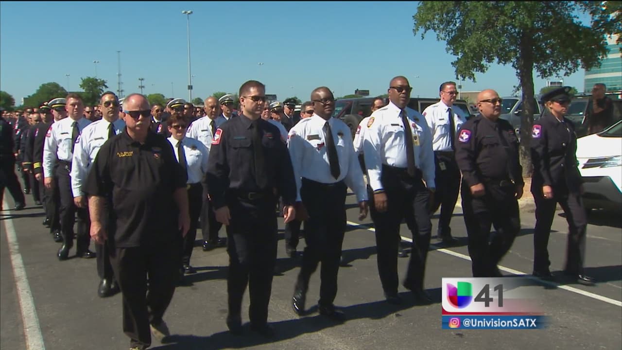 Los bomberos de San Antonio se dieron cita en el Alamodome para realizar una marcha hacia el Alamo, en honor al gombero Scott Deem, quien murió atrapado en un incendio la semana pasada.