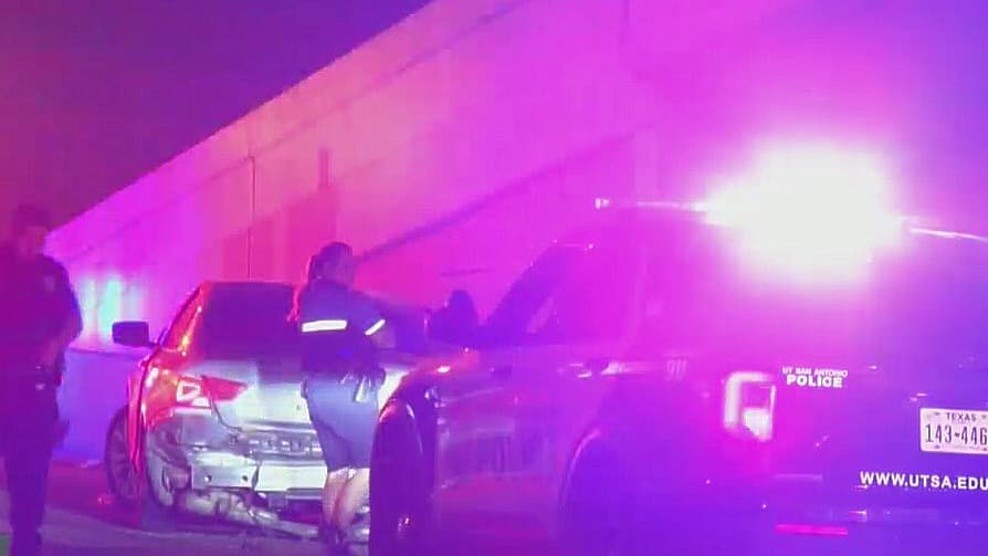 Un hombre terminó con una fractura de brazo tras saltar de un puente hacia un área con maleza luego de que condujera su auto y fuera perseguido por la Policía de UTSA tras chocar con una patrulla.