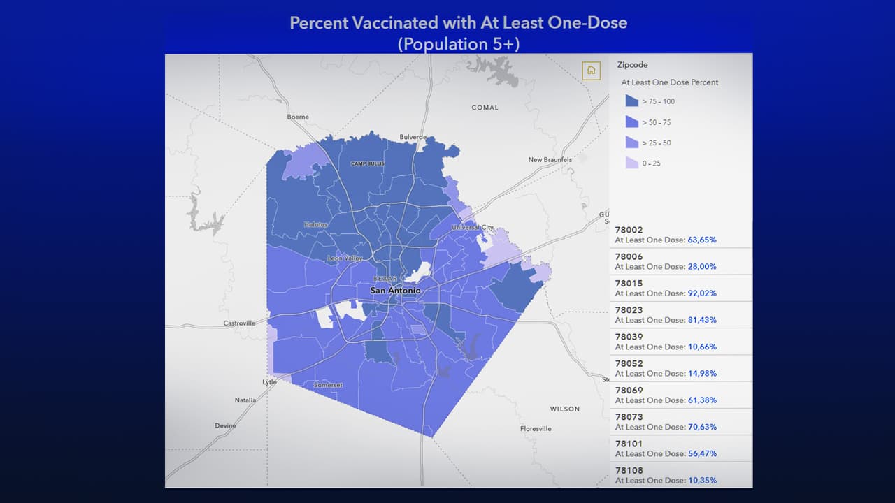 Los datos de la ciudad de San Antonio muestran que algunos de los códigos postales con mayor cantidad de personas vacunadas son 78216 (99.00%), 78257 (99.00%), 78258 (99.00%) y 78015 (92.02%). Estos cuatro códigos de área tienen a más del 90% de su población vacunada.