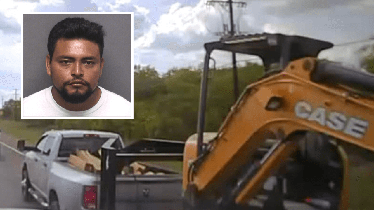 Yudi Aguilar conducía una Dodge Ram Dually, con un remolque plano que cargaba una cargadora de construcción.