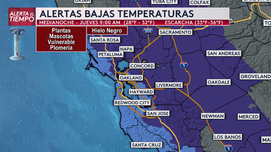 Durante las primeras horas de la mañana las temperaturas serán muy frías, por debajo de los 38 F hacia San José, 34 F en Santa Rosa y 43 F en San Francisco. Proteja a las personas más vulnerables, así como a sus plantas y mascotas. Mantenga mucha precaución en la carretera, principalmente hacia los condados de Marin, Sonoma y Napa porque puede encontrar la formación de hielo negro. Hacia la tarde tendremos algunas nubes y sol con temperaturas máximas ascendiendo a los 55 F grados en San Francisco, 56 F en Oakland, 59 F en San José y 61 F en Santa Rosa.