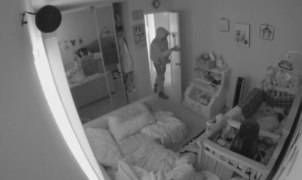 El ladrón se ve en el piso de arriba, asomándose al dormitorio de una niña de cuatro años y un niño de un año mientras dormían. Su madre estaba durmiendo en la habitación de al lado.